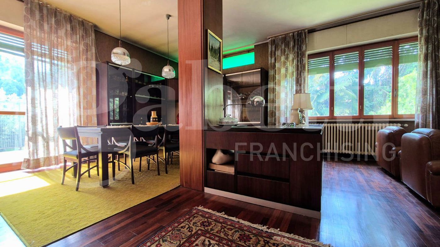 Attualmente la soluzione, di generosa metratura, si compone di due diversi appartamenti, utilizzabili da due distinti nuclei familiari; al piano rialzato troviamo il primo appartamento, con ingresso in corridoio che conduce al doppio salone con zona pranzo, la quale gode di accesso ad un'ampia terrazza.