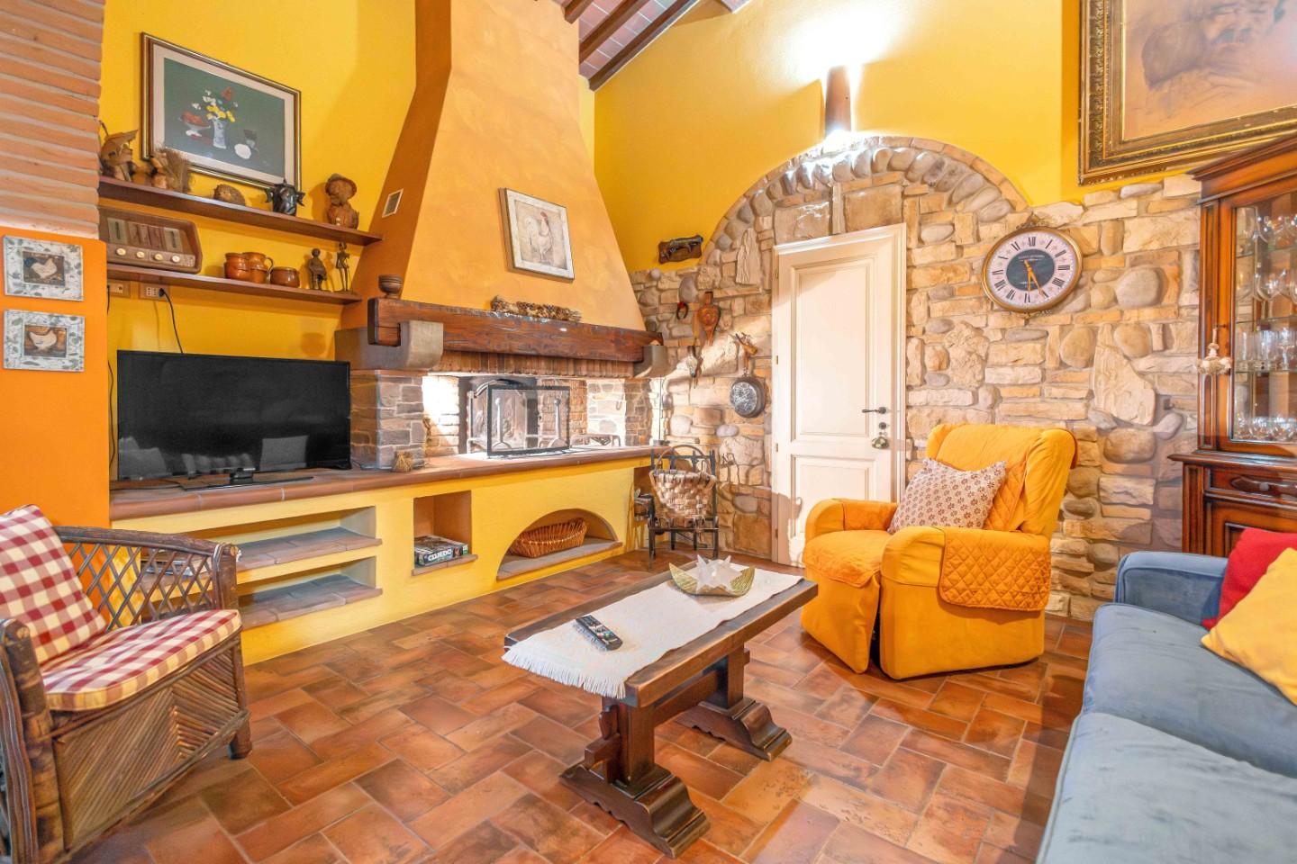 Attraverso una scala si accede alla parte sottostante costituita da una grande zona taverna con camino ed uscite verso il giardino, bagno e vani pluriuso.