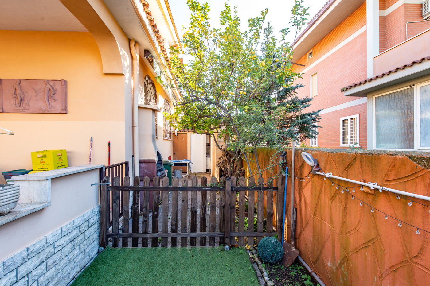 Vicino a questo patio si estende un lembo di terra dove irrompe una bella pianta di limone, ripostigli e attrezzatura per una cucina allaperto.