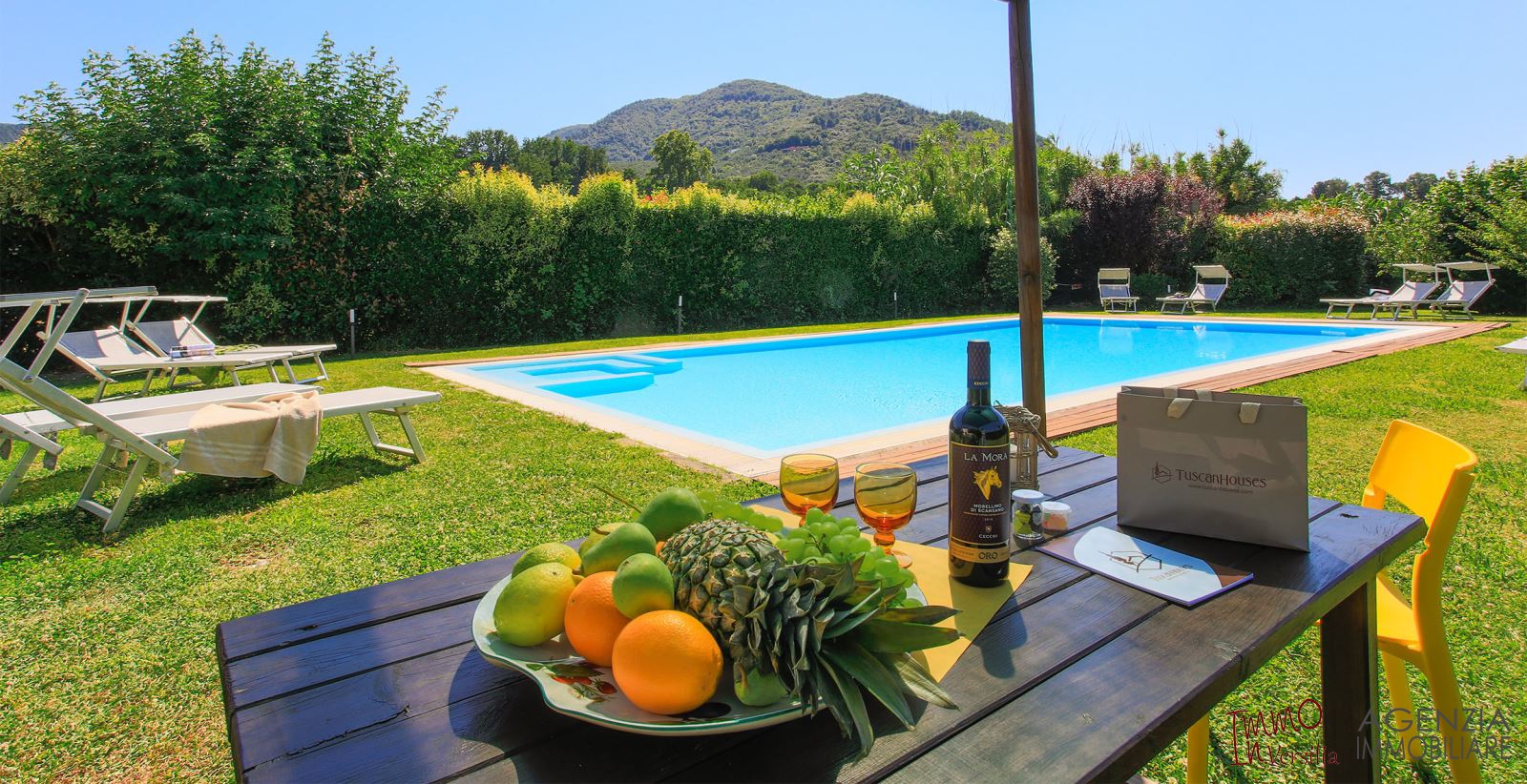 Giardino attrezzato circostante, grande piscina, parcheggio privato con doppio accesso.