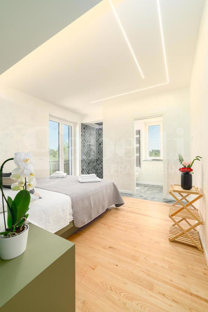 Proseguendo torviamo un viale che ci porta alla zona "rialzata" dove abbiamo 4 camere con 4 bagni indipendenti, 4 letti matrimoniali, sistema surround su ogni camera, aria condizionata con purificazione dell'aria, cromoterapia con celo stellato.