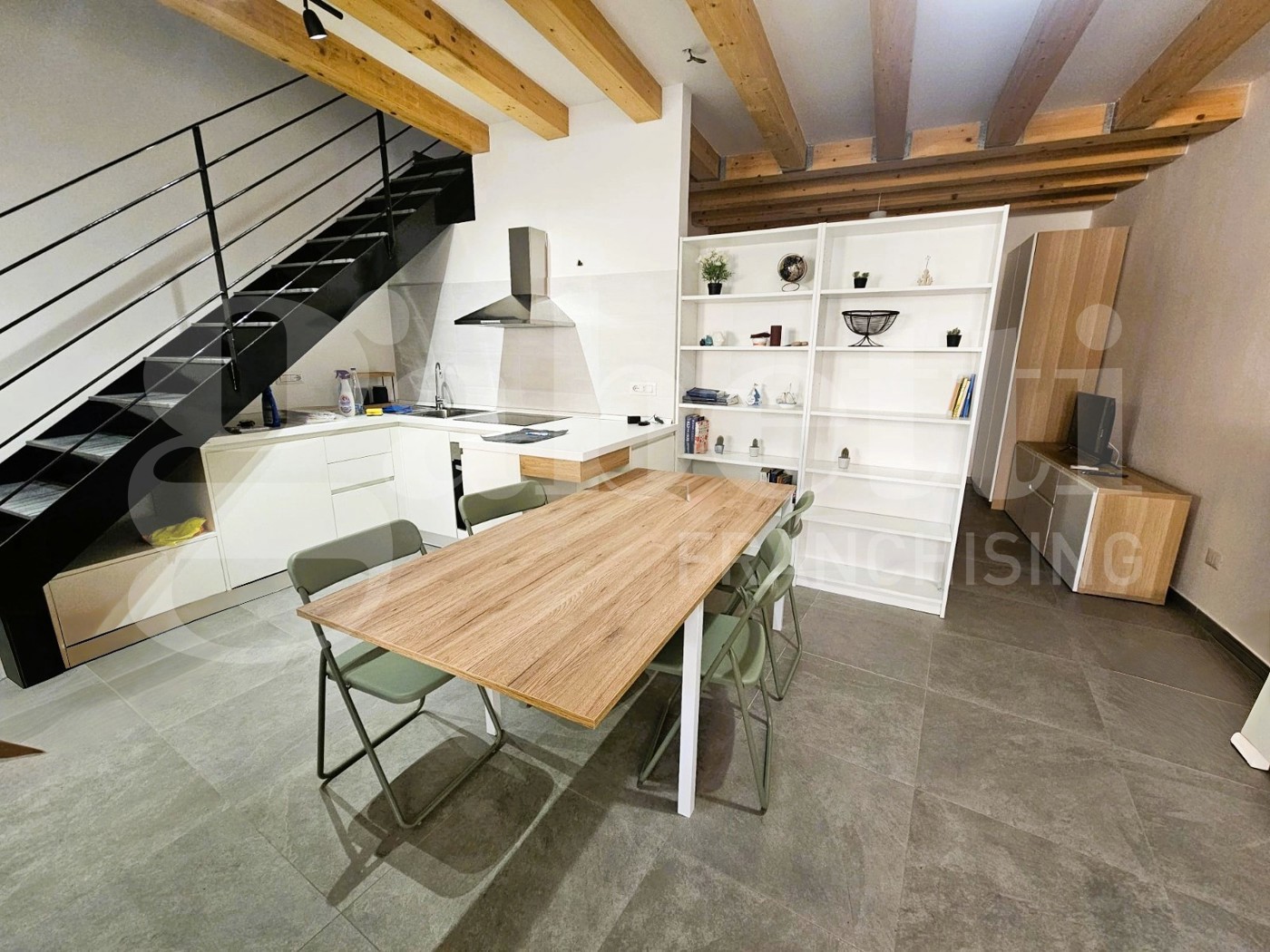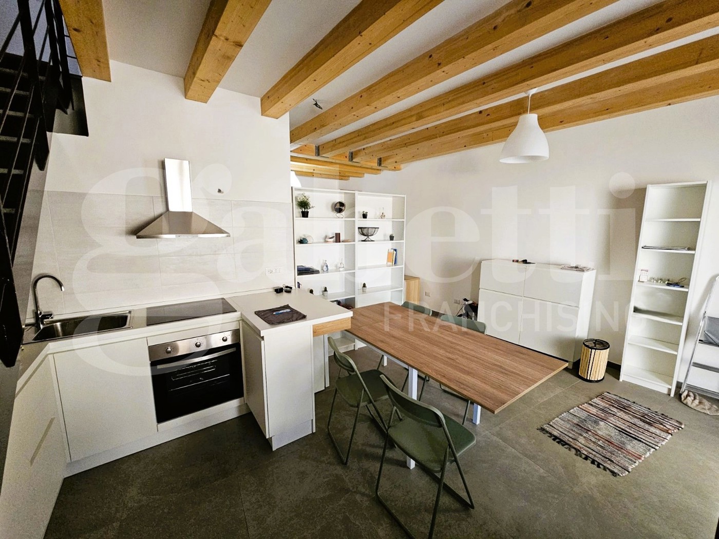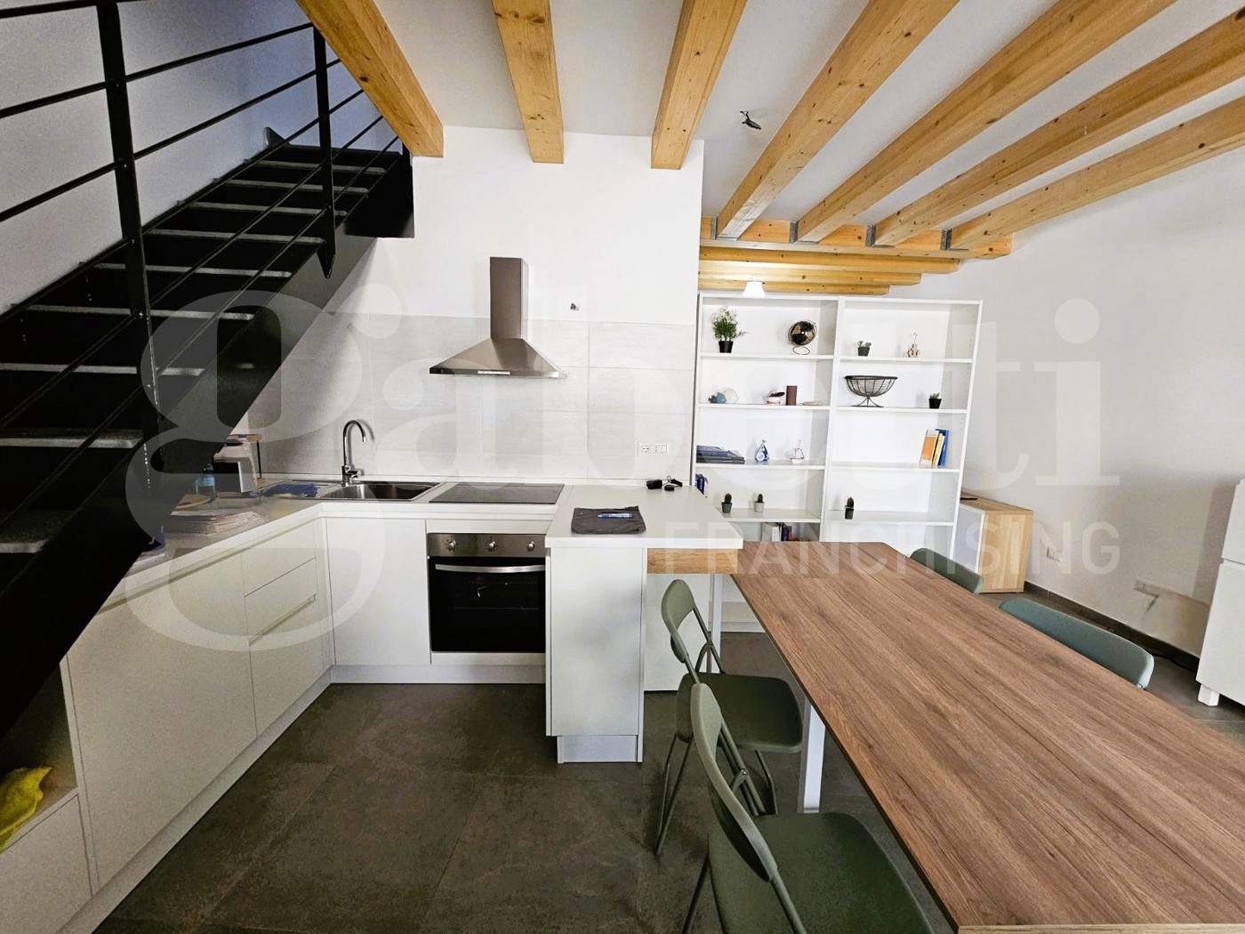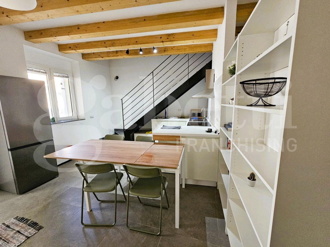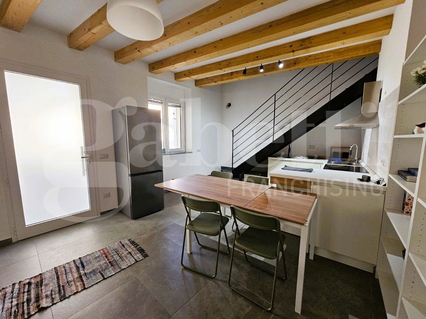 Al piano terra troviamo una moderna cucina a vista con zona living, ben disimpegnata tramite un arredamento funzionale e studiato ad hoc; troviamo poi un bagno dotato di box doccia e lavanderia.