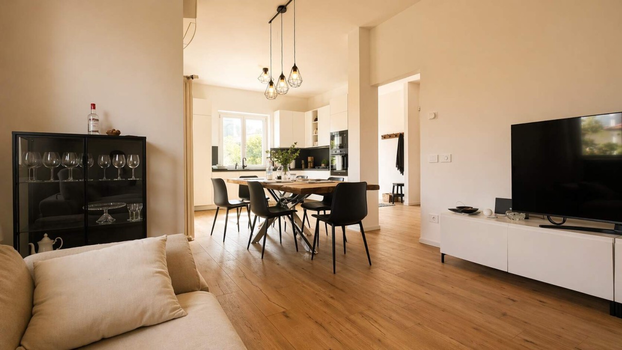 Distribuzione interna L ingresso si apre su una ampia zona giorno open space, luminosa e perfettamente organizzata, dove soggiorno, sala da pranzo e cucina convivono in un ambiente moderno, accogliente e altamente funzionale.