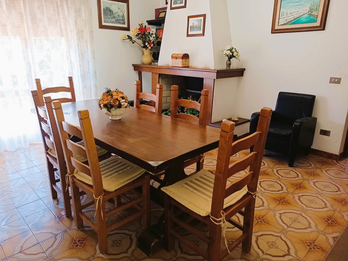 Primo piano con salone, sala da pranzo con cucinotto e camino, tre camere, due bagni e tre balconi.